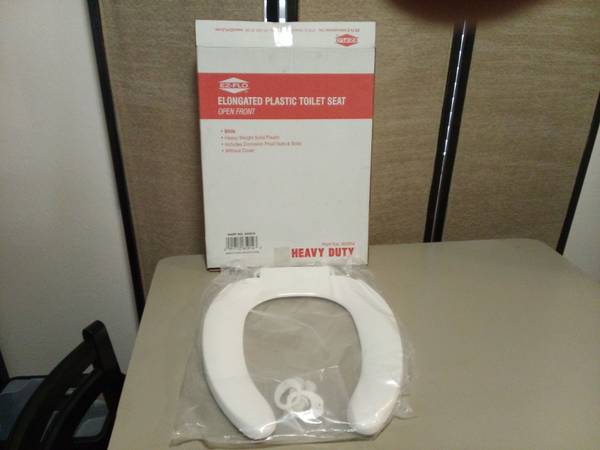 EZ-Flo 65914 open front elongated plastic seat, no lid. Color is white. New, in box. Includes mounting hardware. Commercial toilet seat. Fits Elongated Bowl. Price is firm.