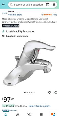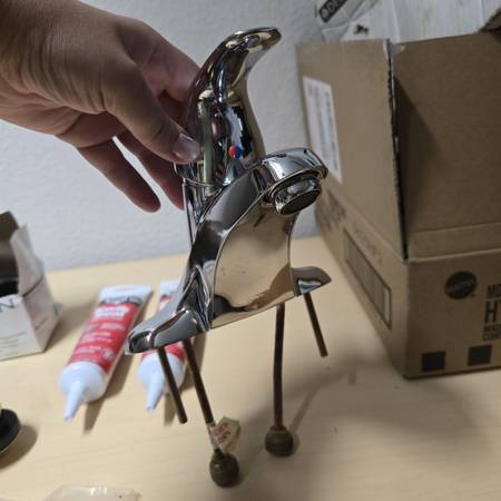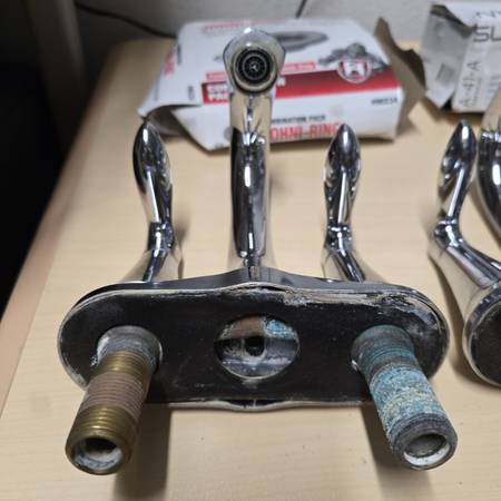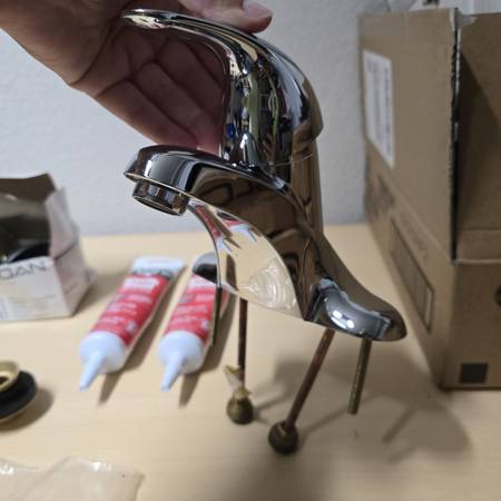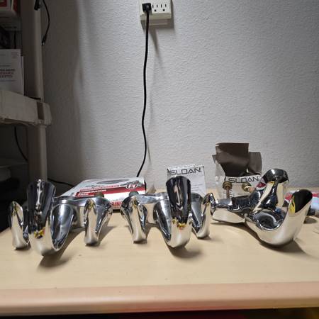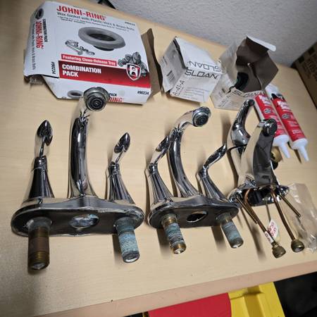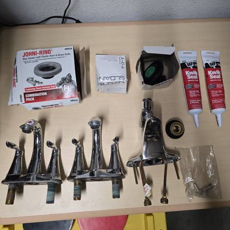 2 pc. Moen Eva Chrome Two-Handle Centerset Bathroom Sink Faucets (used), 1 Moen Chateau Chrome Single Handle Centerset Lavatory Bathroom Faucet (new), 2 tubs Kwik Seal (new), 2 Sloan A-41-A water...