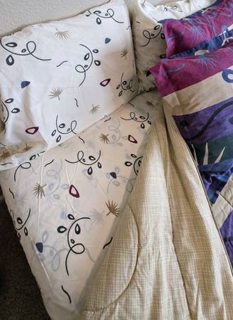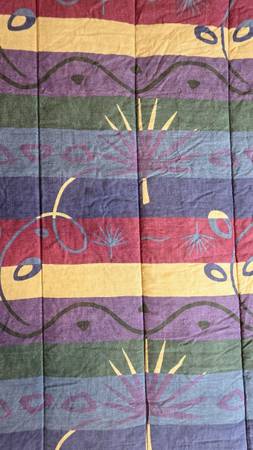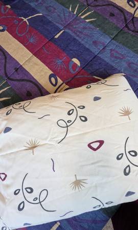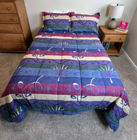 Vintage fun and funky full/queen bed set- includes 1 quilt, 2 shams, 2 pillowcases, 1 fitted sheet and 1 flat sheet It is really considered new as I've only washed it once and it came directly out...