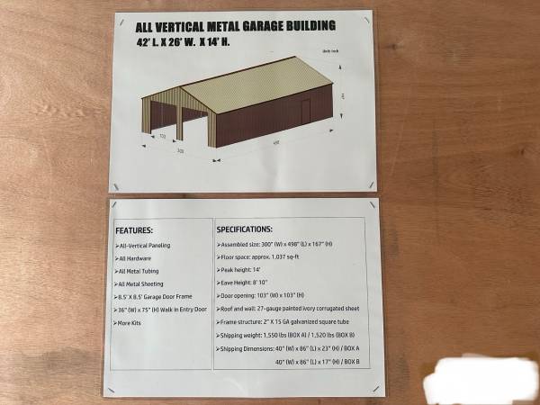 Brand new 42x26x14 all vertical metal double car garage, light ivory with dark brown trim , 15 gauge frame and 27 gauge sheeting, installation available for an extra $3500, delivery also available for a fee , located in oroville show contact info