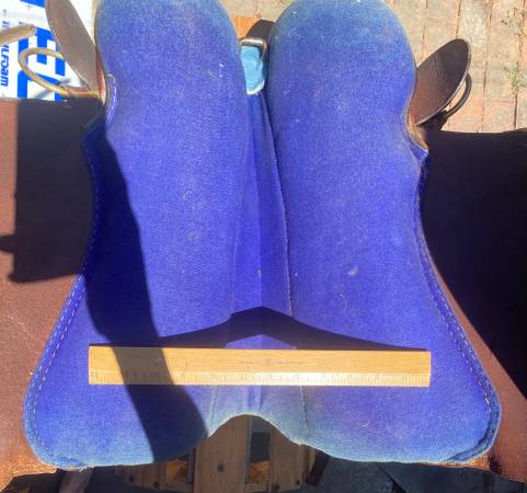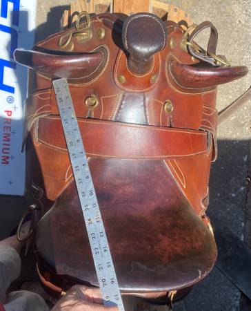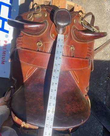 Beautiful leather Australian stock saddle with horn and western leathers. Made by Sydney Saddlery. 2 tone finish with real brass fittings. Comes with classic English cinch and extras: breast collar and extra english leathers with stirrups. Seat is 14" or 15" depending on how you measure it. Nice high pollies to lock your thighs against. Selling because it does not fit my "round back" horse very well. Best fit would be a high-withered horse, or a more narrow-backed horse. $350 or best reasonable offer. Email or text with any questions. Text will get you the fastest response.