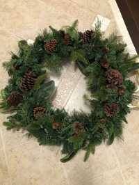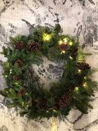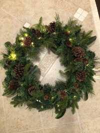 Decorative wreath with pinecones and multicolored lights. Christmas holiday wreath with lights for sale Excellent condition Different lights option Radius 26” long Email or text for more information...