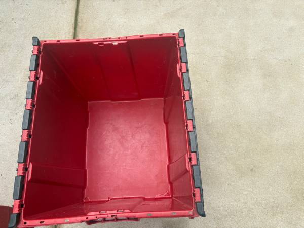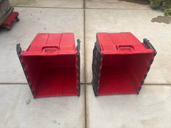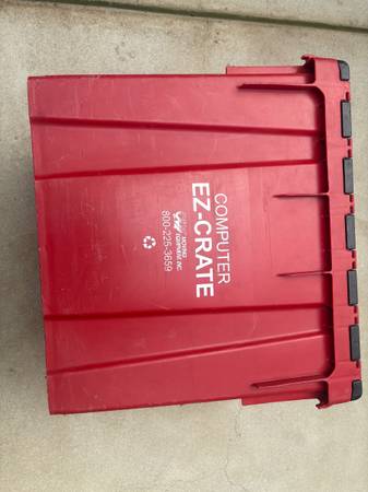 Rubberized plastic containers for either computer, monitors or other fragile items. Bottom of the container is 20" across by 17" wide. Top is 22" across and 18"' wide. Top is closable and sealable....