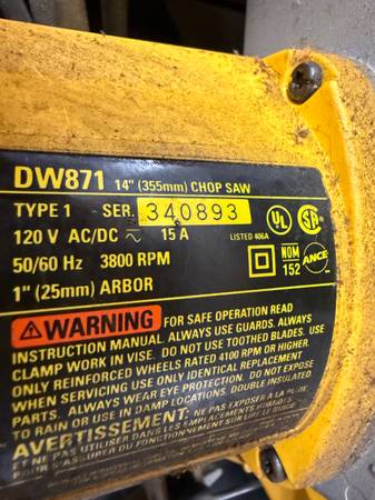 Good condition De Walt 14” chop saw, model DW871, 120 V, 15 amp, 3800 rpm, 1” arbor for cutting metal. This saw retails new for over $600. Asking $125 for but will consider a good offer. Please CALL...
