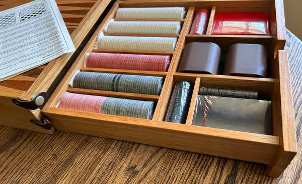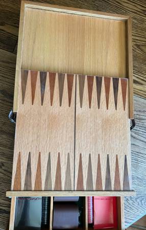 DELUXE GAME SET CHECKERS BACKGAMMON POKER CARDS DICE SOLID WOOD UNUSED