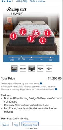 Simmons Beautyrest King Size Mattress or California king mattress. It’s a Beautyrest Silver Plush King Mattress or a Cal king mattress. Each is lightly used but in excellent condition. They are trial mattresses that were only used for about 30 days. They are rated plush and very comfortable. One is a cal king size mattress which measures 72 inches wide, 84 inches long and 14.5 inches thick. The other is a king which is 76 inches wide, 80 inches long and 14.5 inches tall. Each retails for $1,299 plus tax. I AM ONLY ASKING $450 each and I will even deliver it for free. I can also haul away your old mattress for free. Call or text 916 five eight five 0407