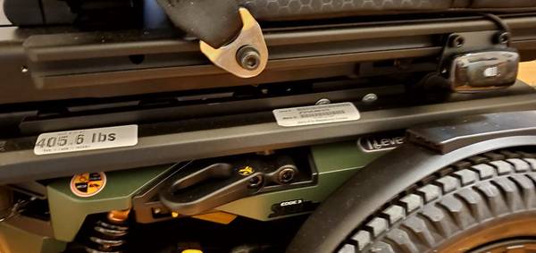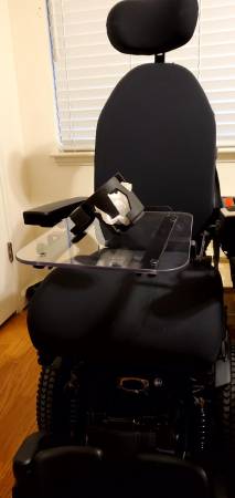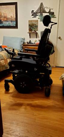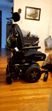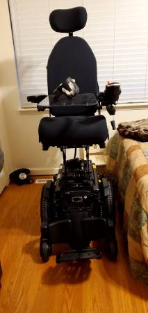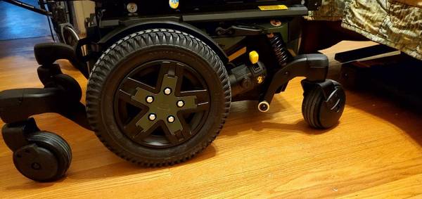 Customizable power wheelchair. Powerful motors. Six wheels. Works great. No longer needed.