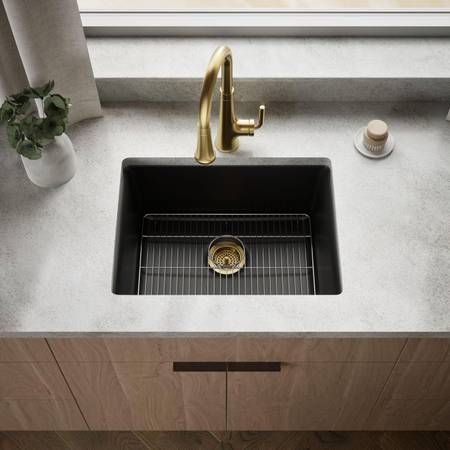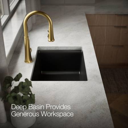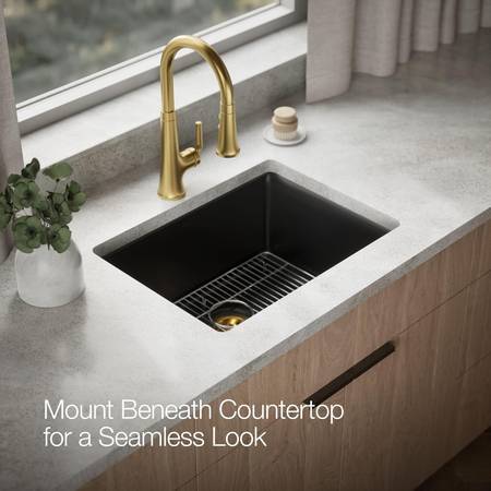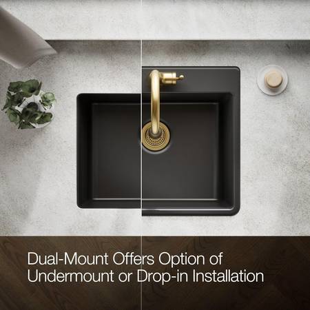 Kohler Kennon RH28003-1-CM1 drop-in kitchen sink in matte black Neoroc granite composite. Single bowl, 25" x 22" x 10" deep, 1-hole faucet setup with stickers for optional 3-hole drilling. Heat-resistant to 750°F, scratch/stain-proof for easy maintenance. Sleek wave design, ideal for kitchen or utility use.