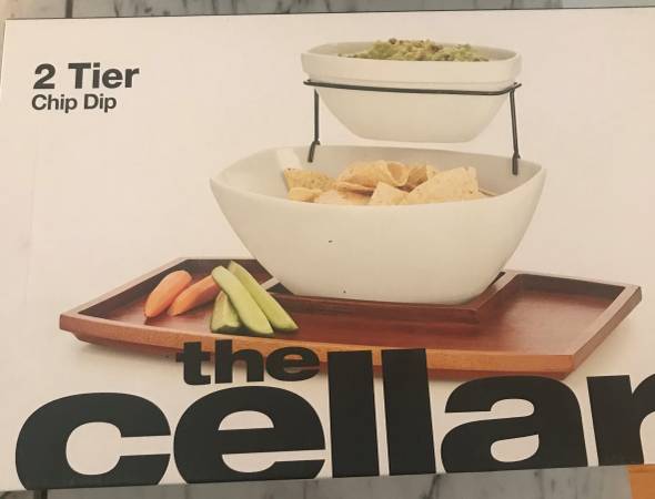Treat your guests to chip and dip with this chic, two-tiered serving set from The Cellar that combines crisp white stoneware bowls with a U-shaped acacia wood tray. Purchased at Macy’s. NEW! Retail $65 - Excellent gift.