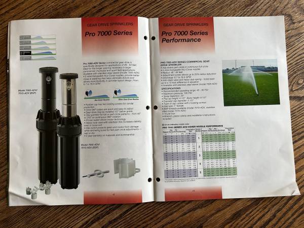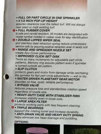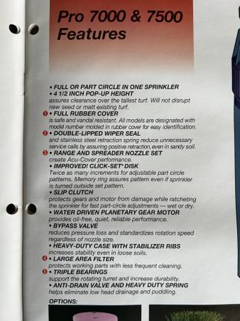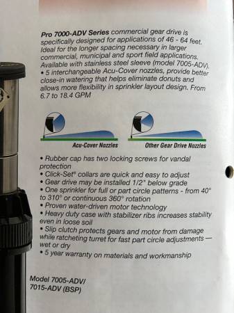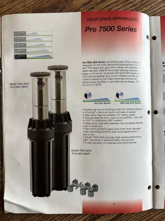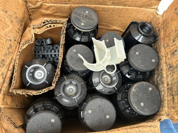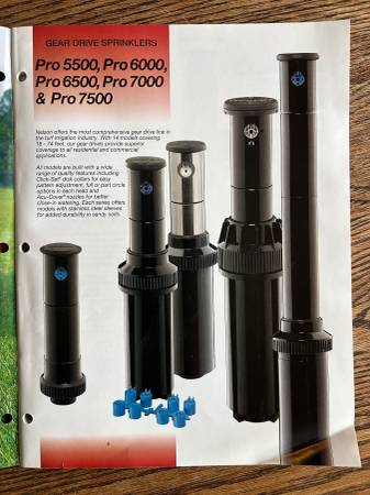 NEW NELSON TOP OF THE LINE STAINLESS SLEEVES TURF IRRIGATION COMMERCIAL GEAR DRIVE SPRINKLERS. THESE SPRINKLER HAVE BEEN STORE OF A NUMBER OF YEARS. DESIGNED FOR APPLICATIONS OF 46-64 FEET. I HAVE (8) OF THE PRO 7000 SPRINKLERS, AND (3) OF THE 7500 SPRINKLERS, $25 EACH OR $170 OF ALL 11 SPRINKLERS. SEE PHOTO FOR MORE INFORMATION ABOUT THE NELSON SPRINKLERS.