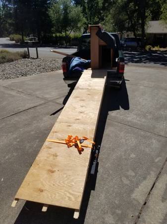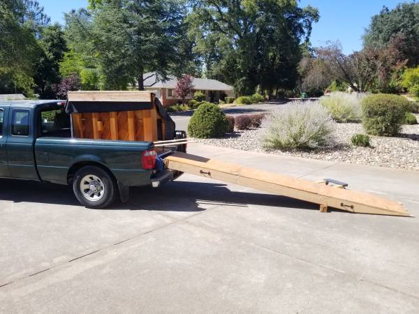 I constructed this 2 ft wide, 12 foot long ramp to load a 600 lb Steinway piano onto the back of my Ford Ranger pickup. The ramp consists of 3 new 12 ft 2x6s overlaid with T-111 fir siding. The ramp didn't flex at all while moving the piano into the bed, so I suspect it is capable of supporting much more than 600 lbs. The ramp comes with steel handles for tie-down or to help move it around.