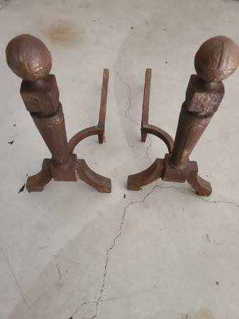 Andirons elevate and support logs in a fireplace to control airflow for a better, longer-lasting fire, and to prevent logs from rolling out of the hearth. They also provide a decorative element that adds aesthetic appeal to the fireplace and hearth, and in historical times, served as cooking implements. These are over 100 years old.