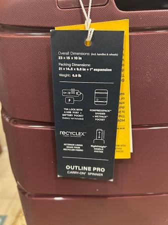 Brand new Samsonite hard shell carry-on. Excellent construction! Dimensions: 21"x14.5"x 9.5". It has dual 360 degree spinner wheels and built in TSA lock. My husband and I asked for luggage for our...