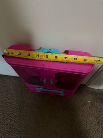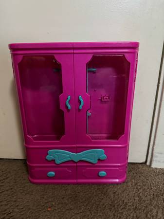 Toy wardrobe for dolls, pink with blue details.