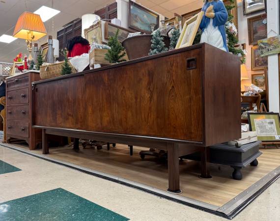 Mid Century Danish Rosewood Large Credenza Sideboard by Omann Jug (84L 32T 18D) $1250.00 *** Space 454 Mid Century Style Coffee Table with Glass Insert Top & Bottom Magazine Shelf $220.00 **...