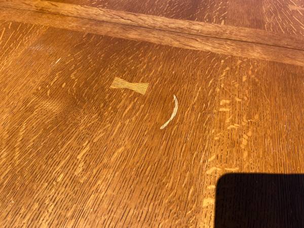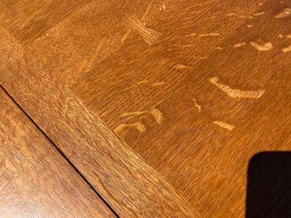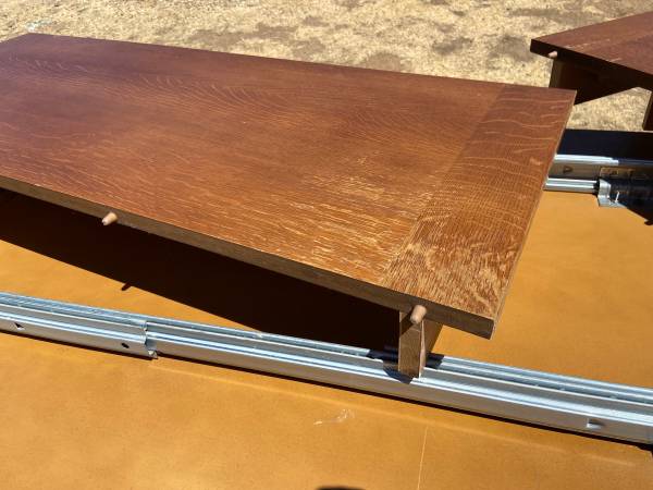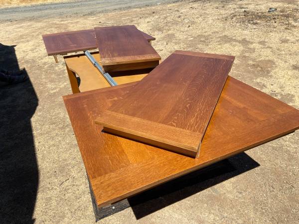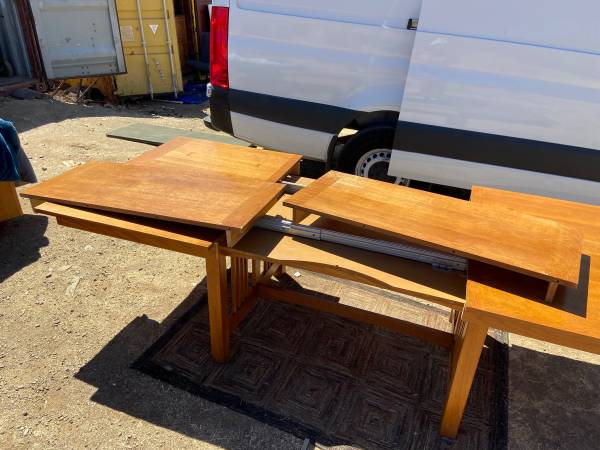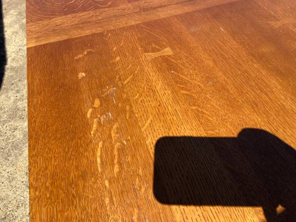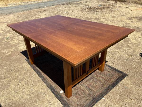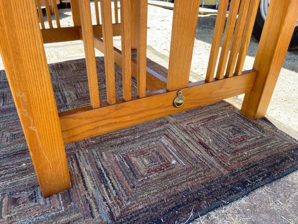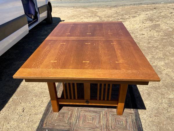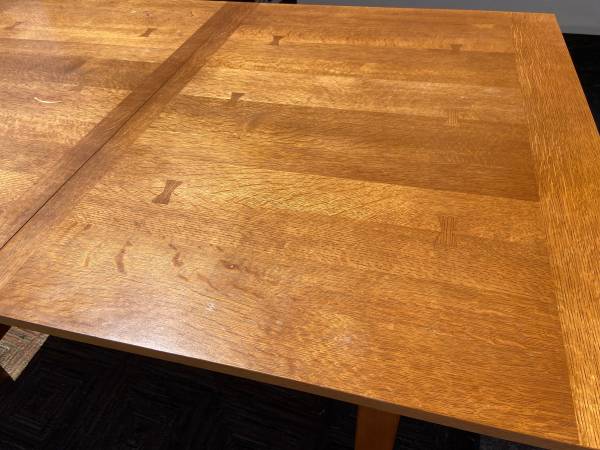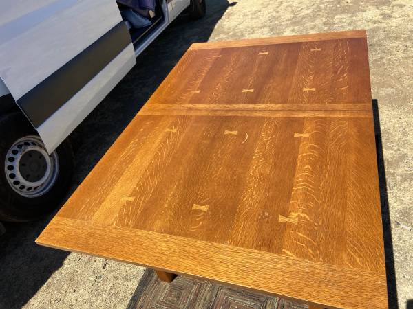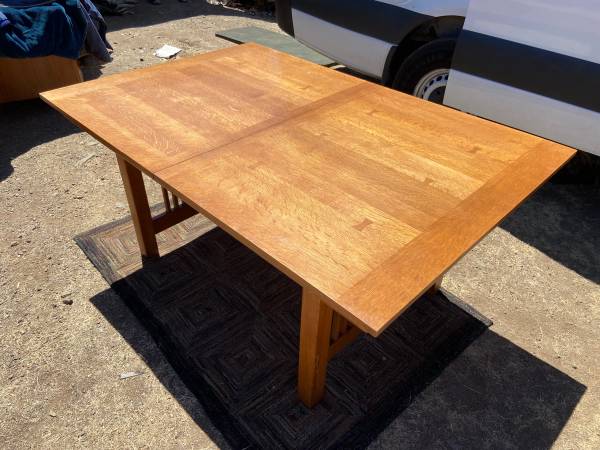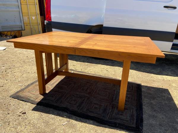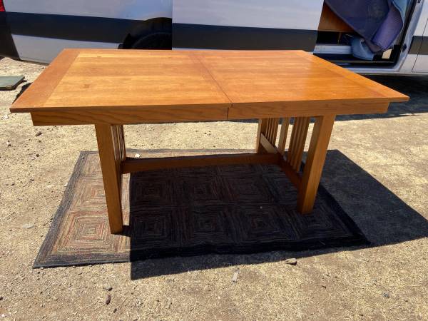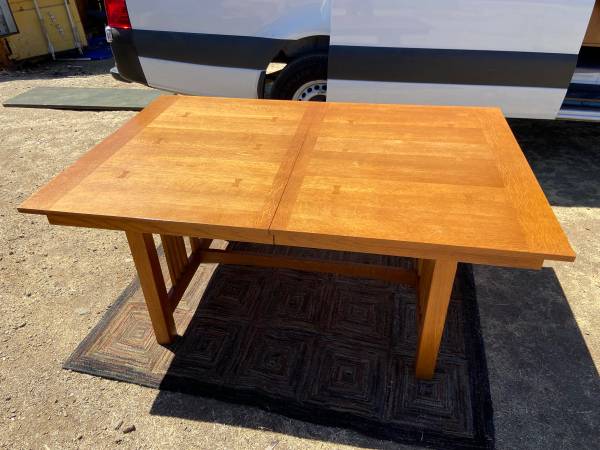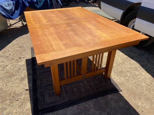Basset furniture mission oak arts and crafts dining trestle table with two extensions 66”/44”/30” extension is 18” 102”/44”/30” Some scuffs on the extension Some scratches see pictures for details...