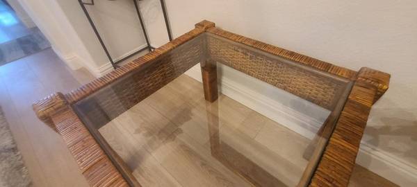 Intricate Woven Rattan Glass Top End / Occasional Table Hard to find in in excellent condition 27" x 27" x 19"H $100 Thanks, Stan