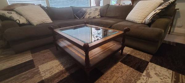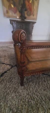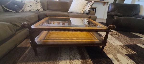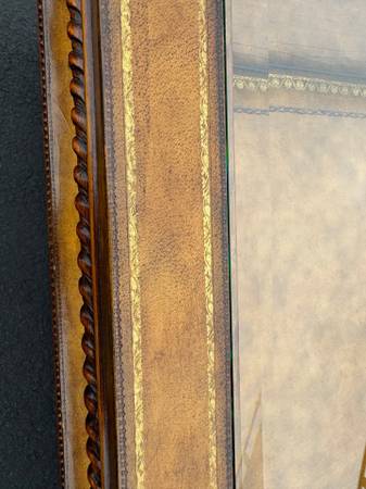 Solid Mahogany Frame and four corner reeded carved legs with upper design. Upper and lower surfaces have carved roping and tooled leather surface, with beveled glass insert over a tooled leather bottom. Excellent construction.
