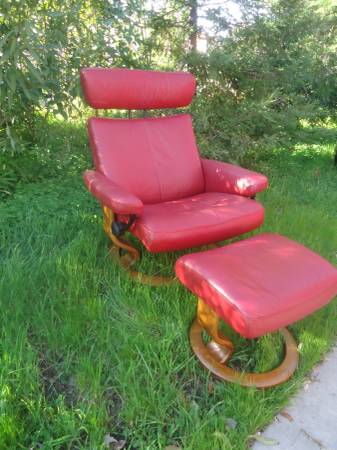 Ekornes Stressless modern leather reclining chair with an adjustable headrest and a matching ottoman size Large , chair rotates 360 degrees and reclines , excellent seldom used condition , Cherry...