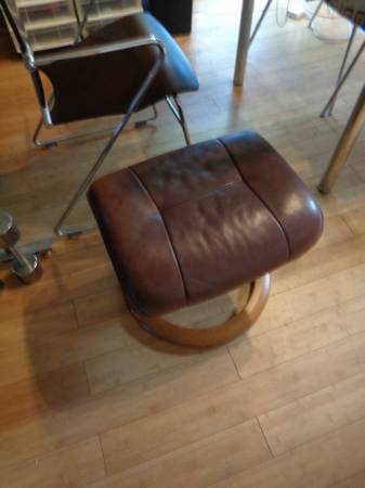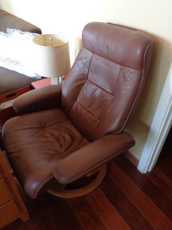 Brown chocolate recliner / easy chair with a matching ottoman , Made in Norway by HJELLEGJERDE MOBLER AS , $600.