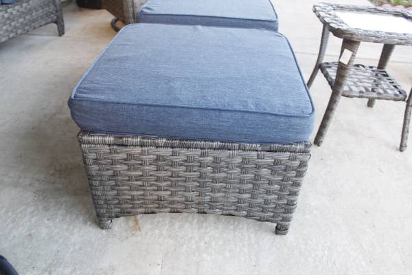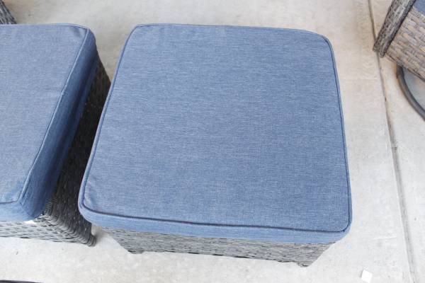 Two side wicker tables or coffee tables with cushions covers. The cushions are easily removed so they can be used with or without cushions.