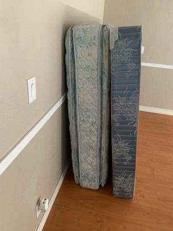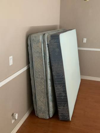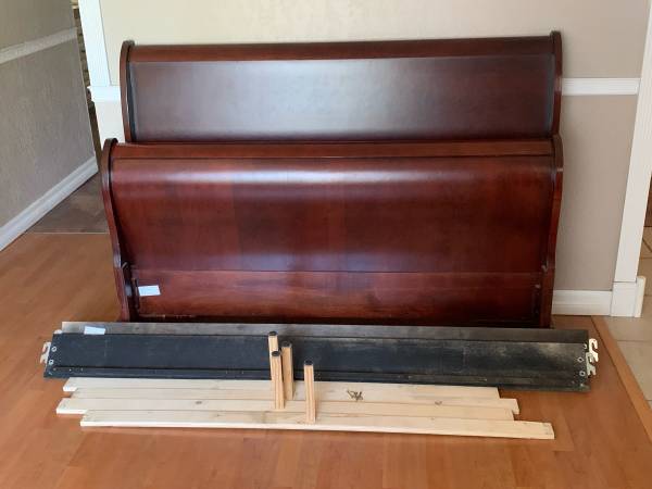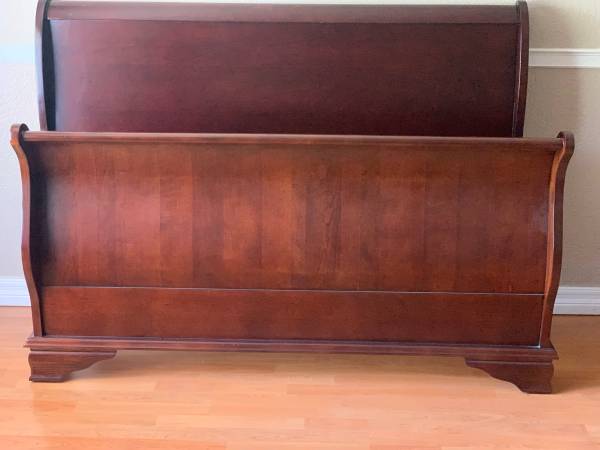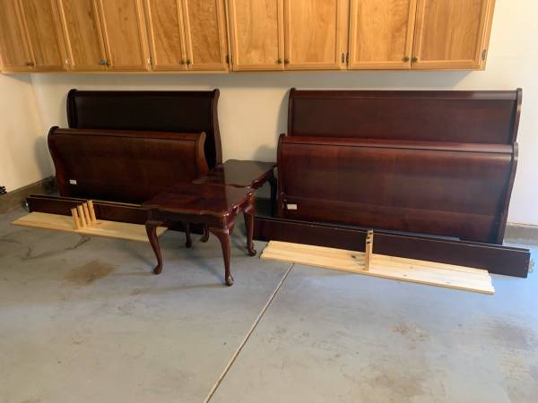 2 Queen sleigh bed frames with two side tables, comes with one box spring and one mattress!