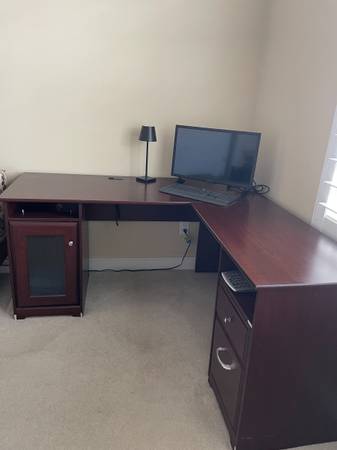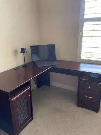 CORNER DESK FOR SALE: 1 File Drawer, Utility Drawer, 2 cubby shelves plus glass enclosed cubby. $100. Can deliver within Davis, Dixon or Woodland for small fee. 60"x60" length.