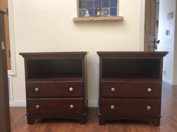 A pair of brown cherry nightstands. Can be sold individually (for $25 each) or as a set ($45). Pick up and cash only, please.