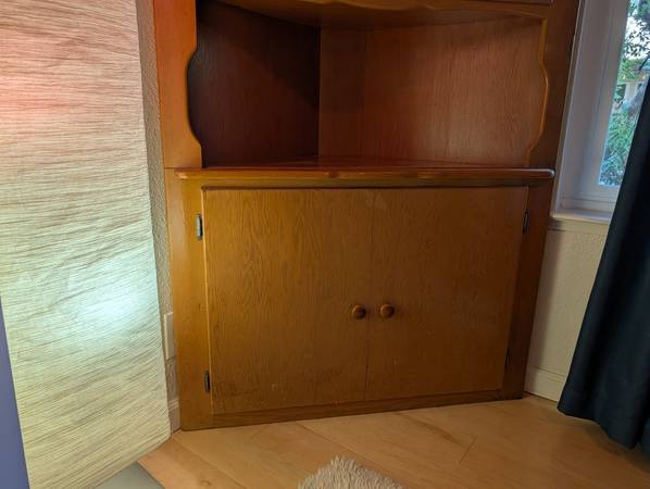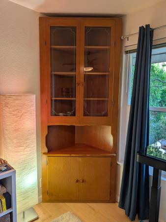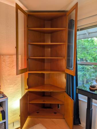 Spacious solid wood corner cabinet with upper glass doors and lower wooden cabinet. Seven shelves total. This separates into two pieces for transport. Custom made in Berkeley in the 1940s.