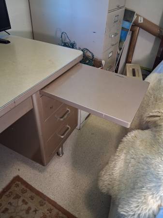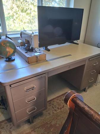 Made by SteelCase originally sold from university. It is described as indestructible. Probably good in an earthquake for safety. It is beautifully made to use -detailed in design -pull-outs for your computer or typewriter and spacious desktop. Many interior designers or antique dealers would love. Originally called a TANKER desk -..."is a heavy-duty, mid-century steel desk with a simple, industrial design. It is a type of pedestal desk, featuring a flat working surface on top of two pedestals, or cabinets, of drawers. The name "tanker" comes from its durable, all-steel construction, which made it nearly indestructible." Beautiful to use.