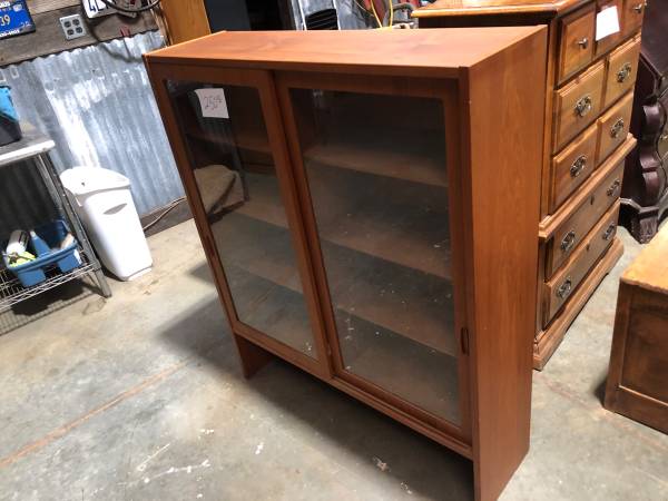 Large estate furniture to sell Mid century modern and Danish pieces plus more to come Large Teak cabinet, two door w/ shelves 350.00 It measures 48x15x42 high Teak upper cabinet w/ glass doors...