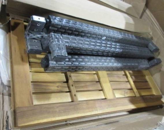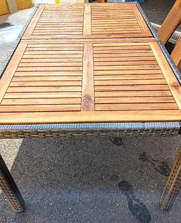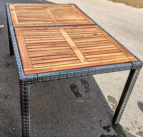 NEW IN BOX NICE SOLID OUTDOOR DINING TABLE FROM COSTWAY. WICKER-WRAPPED STEEL FRAME SUPPORTS A SOLID ACACIA WOOD SLAT TOP. MEASURES 3FT. X 5FT. AND SEATS 6 CHAIRS. SEE MORE GREAT DEALS ON PRODUCTS...