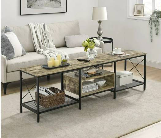 NEW IN BOX GREY FAUX BARNWOOD AND BLACK STEEL WITH STEEL MESH SHELVES. SUPPORTS UPNTO 75" TV. SEE MORE GREAT MONEY-SAVING PRODUCTS FOR YOU YOUR HOME AND LIFESTYLE RIGHT HERE JUST TAP THE "more ads...