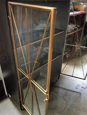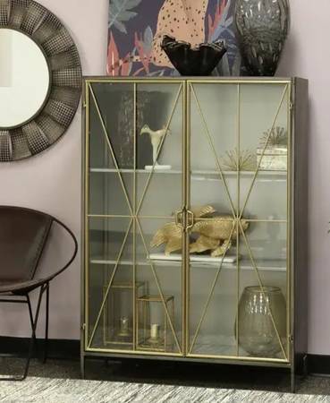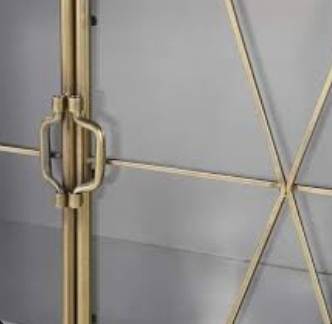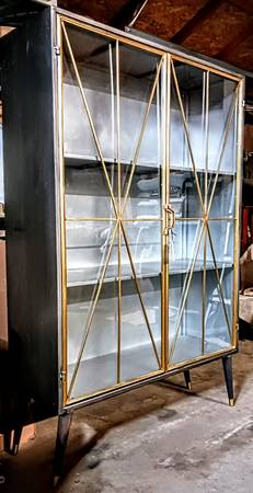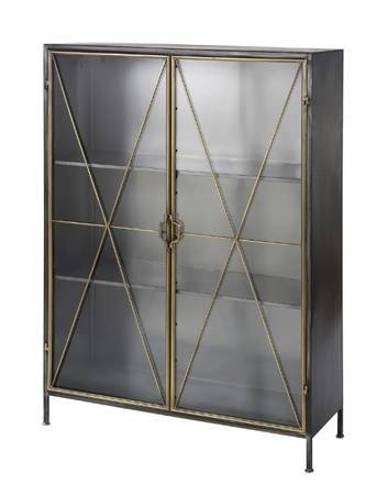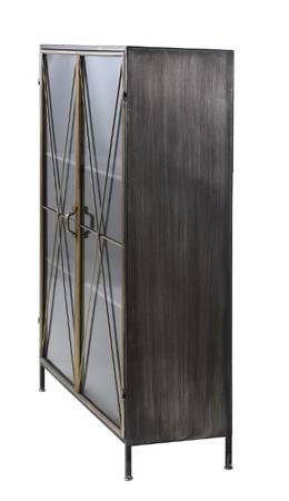 5MM TEMPERED GLASS IN STEEL DOORS. ENTIRE CASE INCLUDING SHELVES AND BACK MADE OF STEEL AND FINISHED IN GUN METAL GREY WITH ANTIQUE GOLD PATINA DOORS.