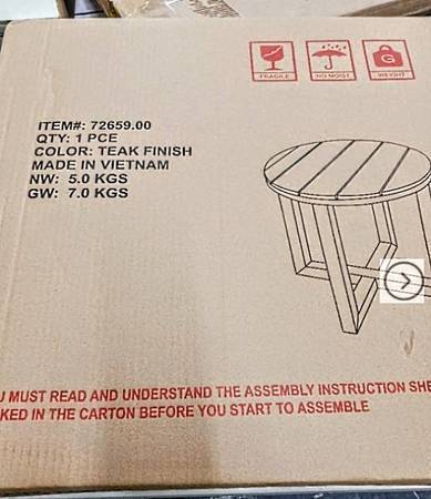 NEW IN BOX REFAILS FOR: $200 after tax. TWO 18" DIAMETER ROUND SOLID ACACIA WOOD OUTDOOR SIDE TABLES. TRESTLE BASE DESIGN. A DESIGN STYLE THAT FITS ALMOST ANY MOTIF. SOLID AS ALL GET OUT AND OH...