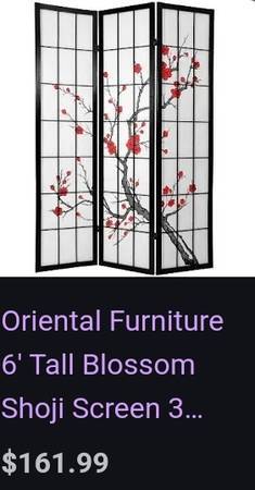 NEW IN BOX 6FT. TALL 3-PANEL CHERRY BLOSSUM SHOJI PRIVACY SCREEN. FROM ORIENTAL FURNITURE, A RESPECTABLE MAKER OF THE FURNITURE MOTIF. SEE THE WALL ART POSTED BY THIS SELLER FOR A PACKAGE DISCOUNT...