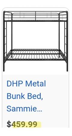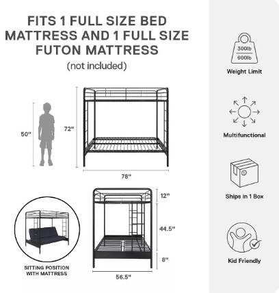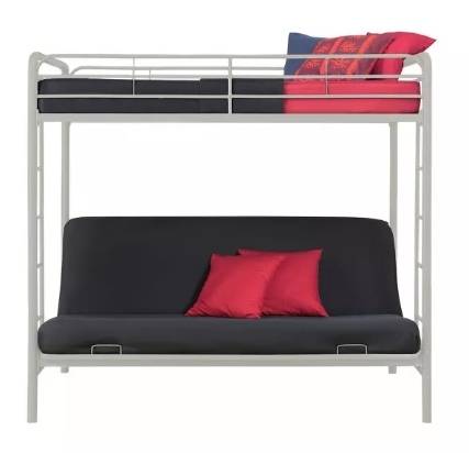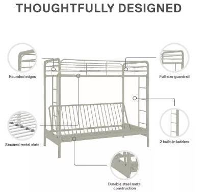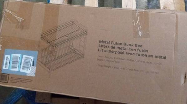 NEW IN BOX RETAILS FOR: $350 - $500 after tax depending upon retailer used. METAL SOFT-EDGE TUBULAR FRAME FULL-SIZE FUTON BED/SOFA WITH OVERHEAD TWIN-SIZE BUNK MAKES FOR OPTIMUM USE OF SPACE. A HUGE...