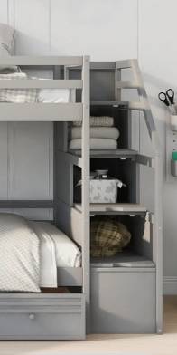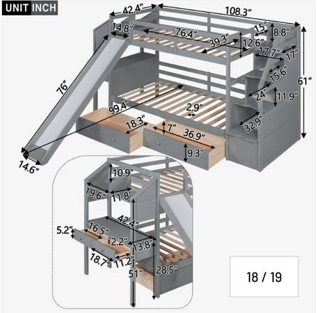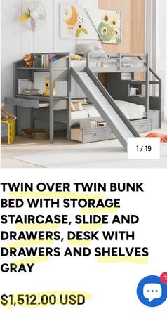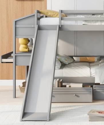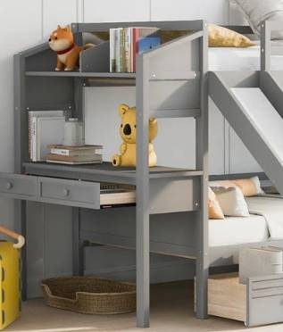 A SOLID WOOD TWIN OVER TWIN BUNKBED WITH A STORAGE-PACKED STAIRCASE, AN ATTACHED DESK WITH LOTS OF DRAWER SPACE AND HUTCH THAT DOUBLES AS A FULL-WITH NIGHTSTAND FOR THE UPPER BUNK AND ONE OF THE ĞREATEST SLIDES I'VE SEEN ON A BUNKBED. SOLIDLY CONSTRUCTED WITH SAFETY IN MIND, WHAT A WAY TO START A DAY OR ENTERTAIN FRIENDS!