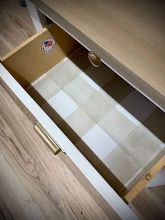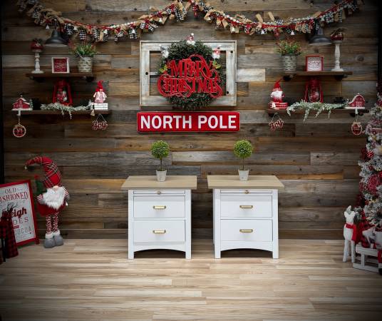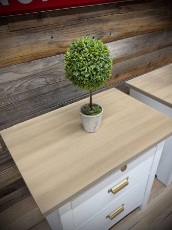 This 2 drawer nightstand set is ready to go! Completely refinished in BM Command White and the tops have been stained in a custom blend of gel stains and sealed. Drawers slide perfectly and have all new champagne bronze hardware on them! Bonus: slide out tray! Dimensions: 25.5” wide x 25” tall x 17” deep.