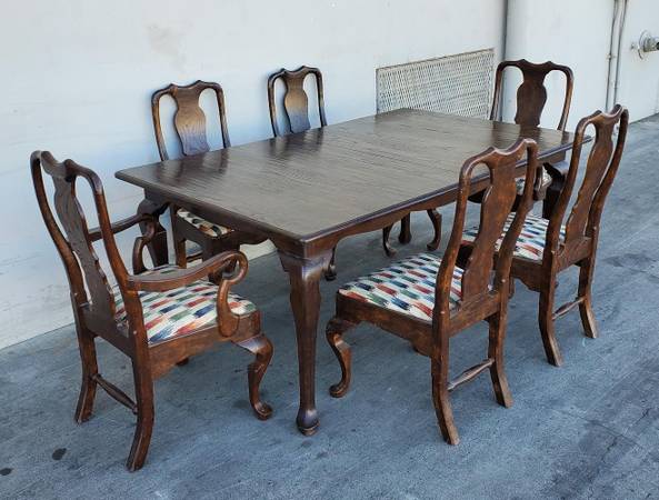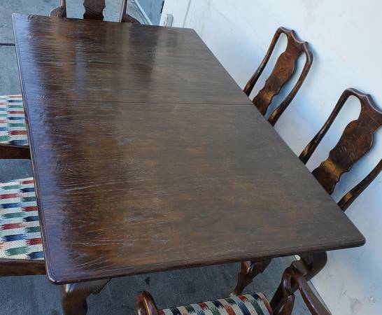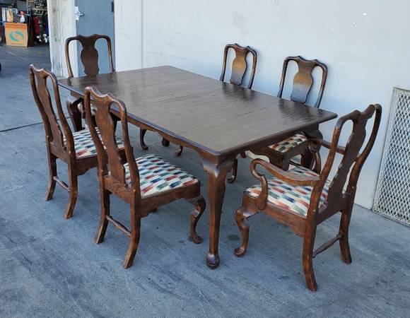 Hello we are selling an Antique Dark wood dining table with 6 chairs, it is in good condition. Schedule appointment by email .