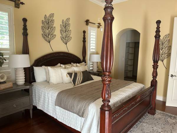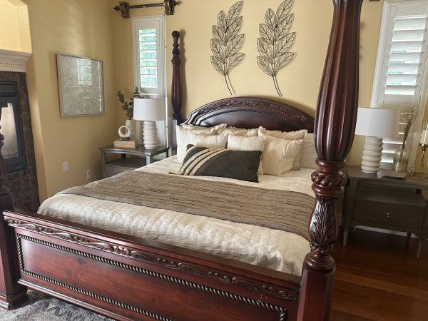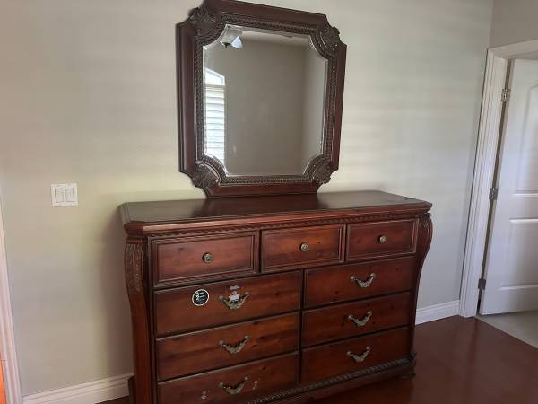 King Size bed and Dresser for sale. Includes mattress. Need it sold by 10/29/2025