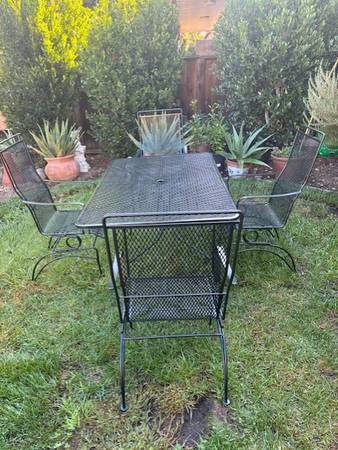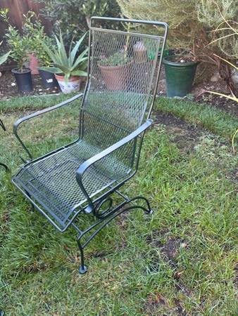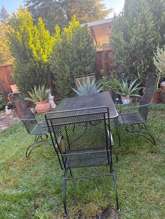 Beautiful Wrought iron table and 4 chairs - All the chairs rock. The table is 66 inches x 38 inches in diameter In great condition. (Dark green color) Asking $ 595 Firm on price, cash only Thanks...
