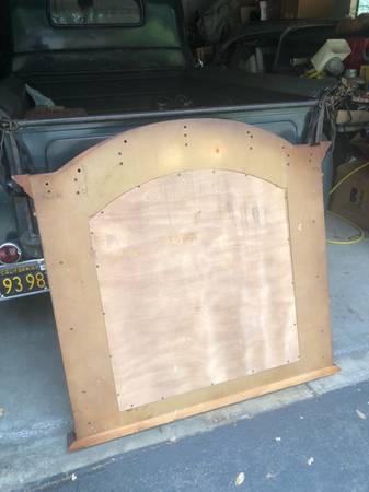 Beveled glass. Frame measures 46" top to bottom at highest point and 49" across at widest point. Mirror measures 32" at highest point, and 29" wide. Beautiful and heavy. See to appreciate. $200.00...