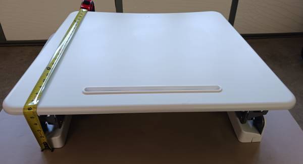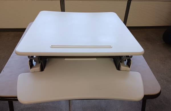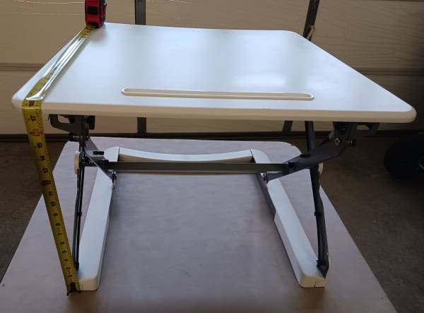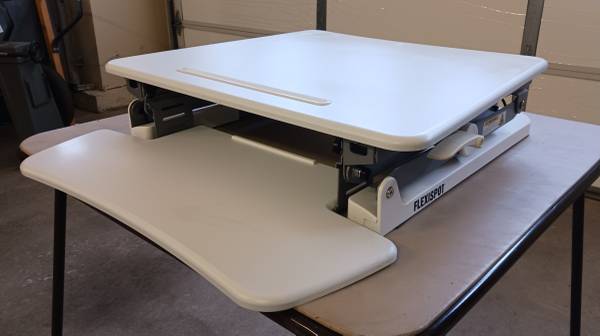 Excellent condition from a non-smoking home. No longer working from home, so not needed. Works great! I used it with a 34" monitor and the laptop with dock fit under the Flexispot allowing you to lower or raise as needed without moving or disconnecting anything (didn't use the laptop screen).