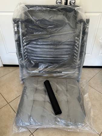 Brand new. Includes chair, cushion, pillow and cup holder. Seat width measures 26 inches. Zzyzx