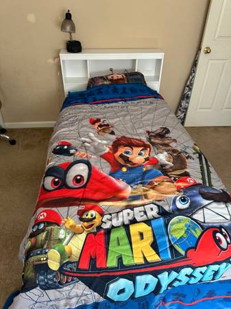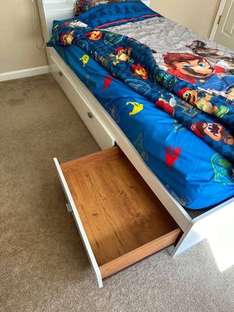 This bed is in like new condition. It was purchased about six months ago along with a brand new mattress, which is a 10 inch gel, memory foam mattress. The mattress protector is included as well, and if you would like the bedding, you may have that as well. There are three large storage drawers under the bed. White wood frame with platform base.