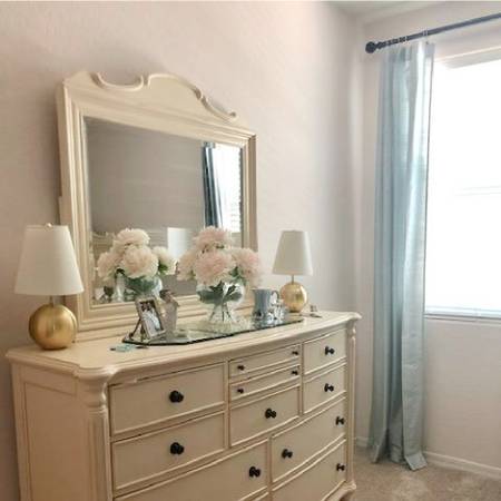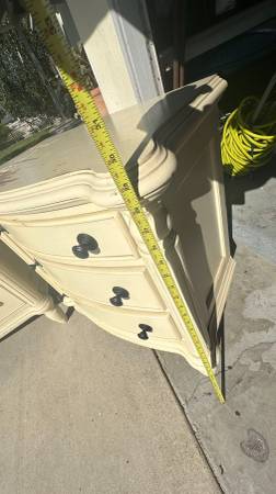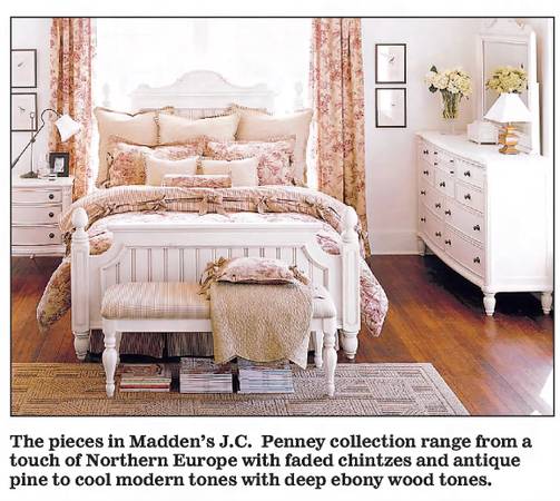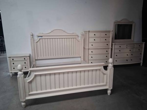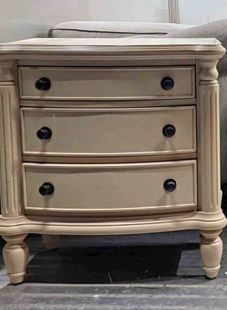 A set of two (2) farmhouse nightstands in antique white. They are in very good "functioning" condition, BUT have cosmetic WEAR on the tops. These are part of the romantic Somerset Line designed by Chris Madden for the JC Penney Home Collection, introduced a number of years ago. Could be a refinishing project on the TOPS only, or simply cover with a cute tray or table cloth. Once you see these, you'll want the matching pieces, and they occasionally come on the market. Showing images of the set for your REFERENCE, but I'm not selling other pieces at this time.