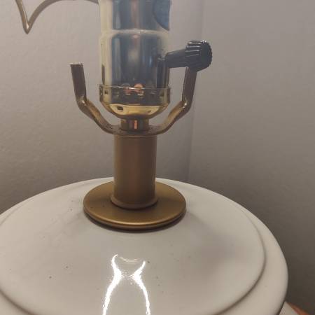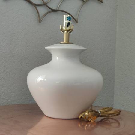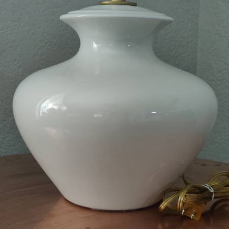 Uniquely shaped white table lamp in a fat rounded ginger jar shape all white glossy glaze with gold neck, socket and cord and a felt bottom to prevent scratching furniture. Contemporary, traditional and simply chic. Will fit in great and complement most decor. This lamp does not have a shade. 15.5 inches tall by 12.5 inches round. Works great. $40.00 cash only.
