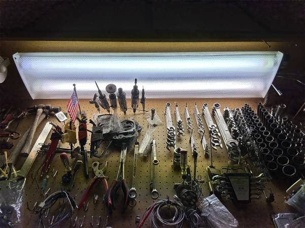 Two groupings: 1. 7' workbench, worklight, overhead cabineets, below cabinets, and 1 double-door cabinet The workbench is 24" deep 2. 3 double-door cabinet sections Each double-door cabinet section...