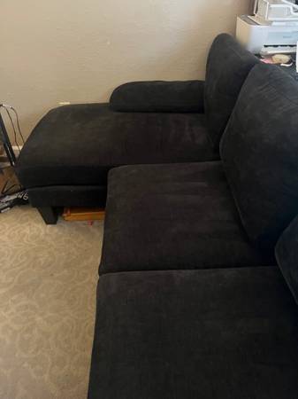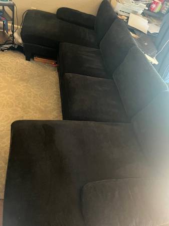 Walmart brand U shaped couch. 9 ft long, 50” wide, 33” tall. Some scruffs, smoke free house. Dark gray/blue.